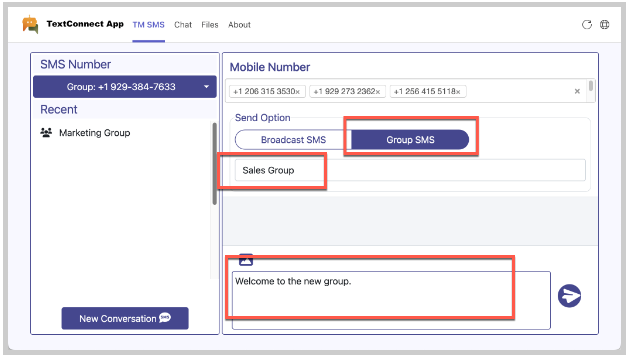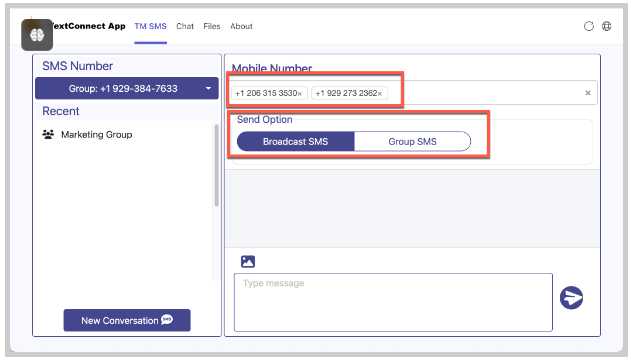 Broadcast SMS – When this is selected, the message is sent to recipients individually. Each recipient appears as an individual contact in the Recent Conversations tab.