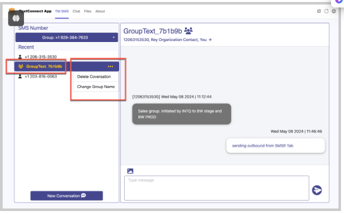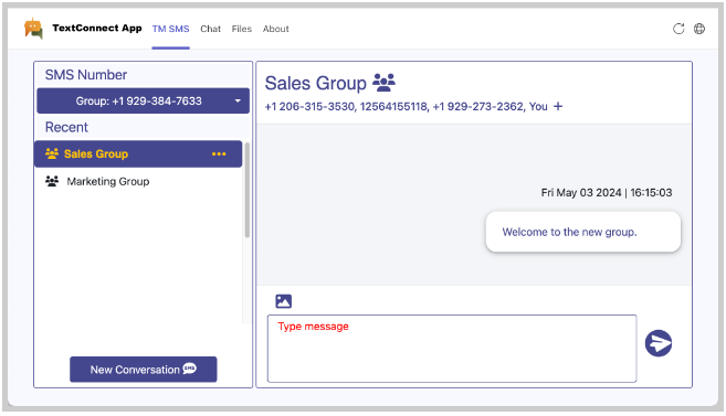 Group members may change the group name through Change Group Name. The group name is specific to members defining it. The updated group also reflects in the corresponding Teams Channel dedicated to the SMS conversation.