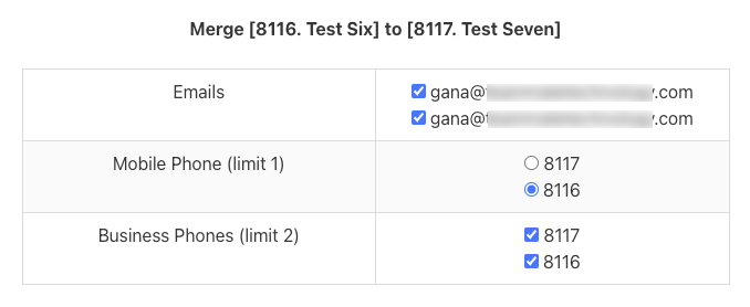 3. A table displaying matching data fields will load. Select the information, such as email addresses, to consolidate.