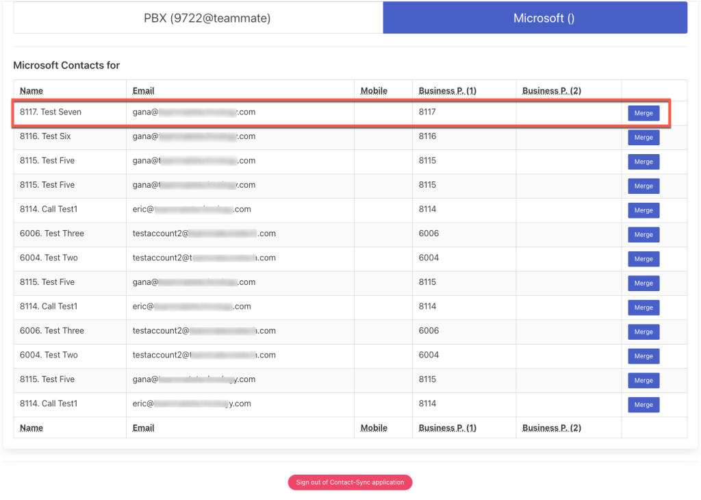 1. Navigate to the Microsoft tab within the Contact Sync dashboard. Locate any duplicate contacts and select the Merge button associated with one contact record.